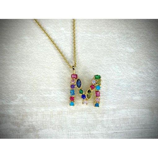 Colgante letra plata chapada 18 kts. la letra hace unos 2 centimetros de alto. Las piedras son zirconitas engastadas . Cadena de plata de ley también con bolitas de 1.5mm. Mandar mail para concretar la letra una vez hechoel pedido se trada unos 10 dias máximo.