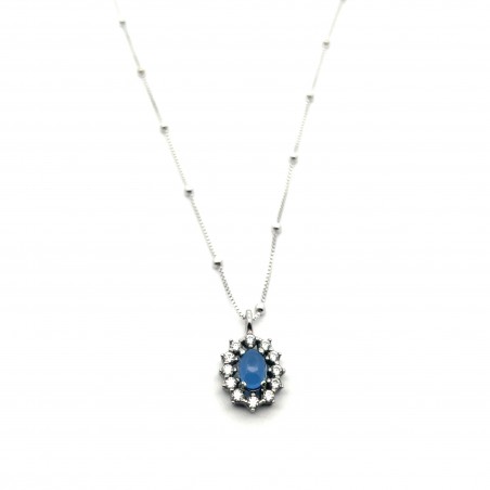 Colgantito de plata con centro de Calcedonia azul natural 6x4mm ( origen de la piedra India). con zirconitas y cadena de plata con bolitas a 40cm mas extensor.