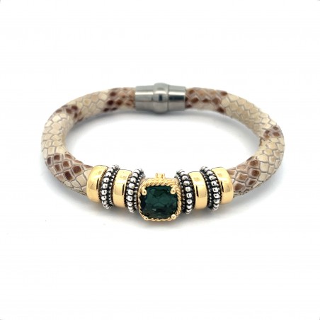 Pulsera de piel de serpiente con aros de plata y plata chapada. La piedra es hidrotermal turmalina. Cierre iman de acero.