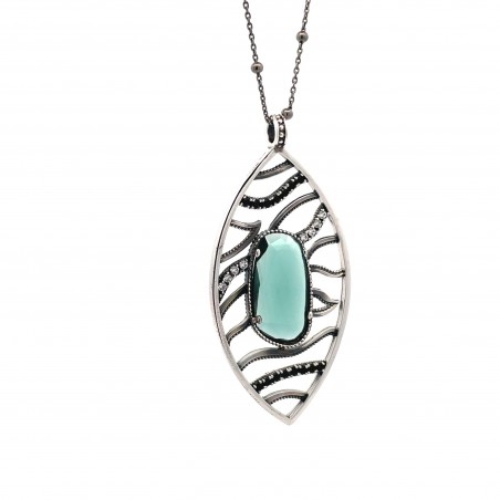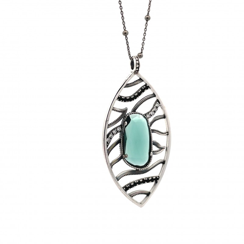 Medallón con cadena a 80 cm de plata en baño de rutenio. Piedra hydrotermal turmalina. Zirconitas espinel de color.