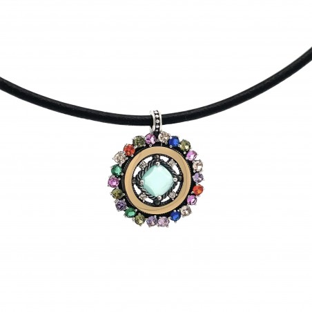 Colgante de plata con cadena a 42cm con piedra calcedonia. Zirconitas colores de 3mm. Espectacular en directo. con un sinfín de detalles de calidad. Alta tecnología aplicada en este colgante.