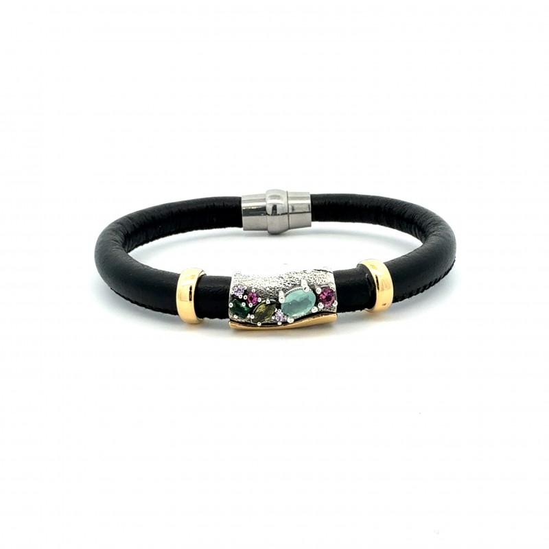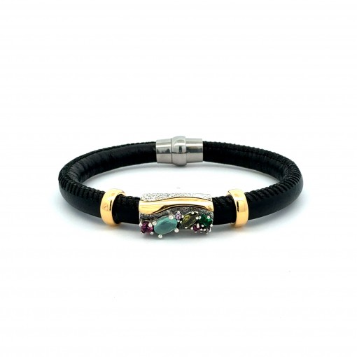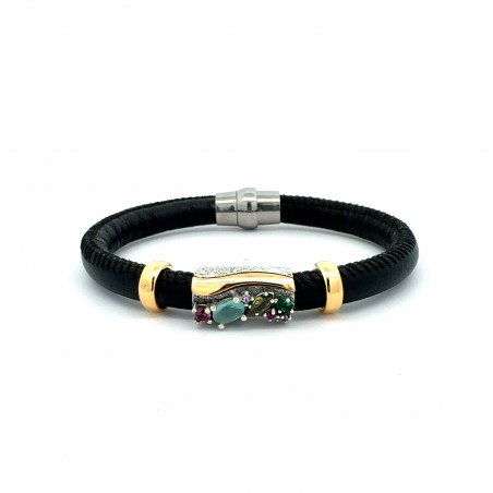 Pulsera cuero 7 mm negra con tubo incrustado con piedras de colores.