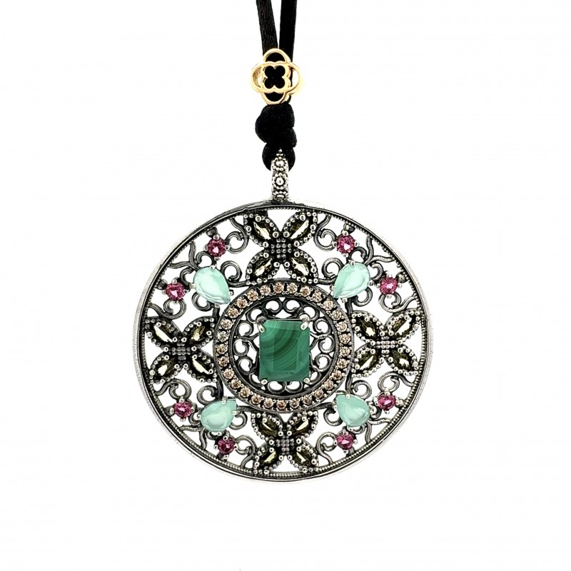 Medallón plata de ley 925 de 49mm de 3 mm de grosor. piedras naturales y zirconitas de color. Seda de 80 cm regulable. Se puede pedir con cadena contactando por mail.