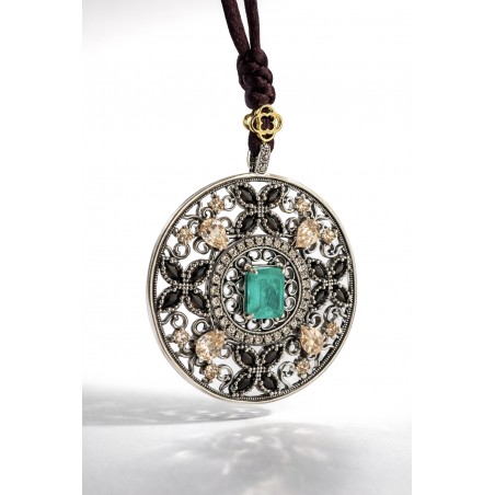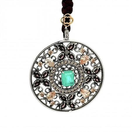 Medallón plata de ley 925 de 49mm de 3 mm de grosor. piedras naturales y zirconitas de color. Seda de 80 cm regulable. Se puede pedir con cadena contactando por mail.